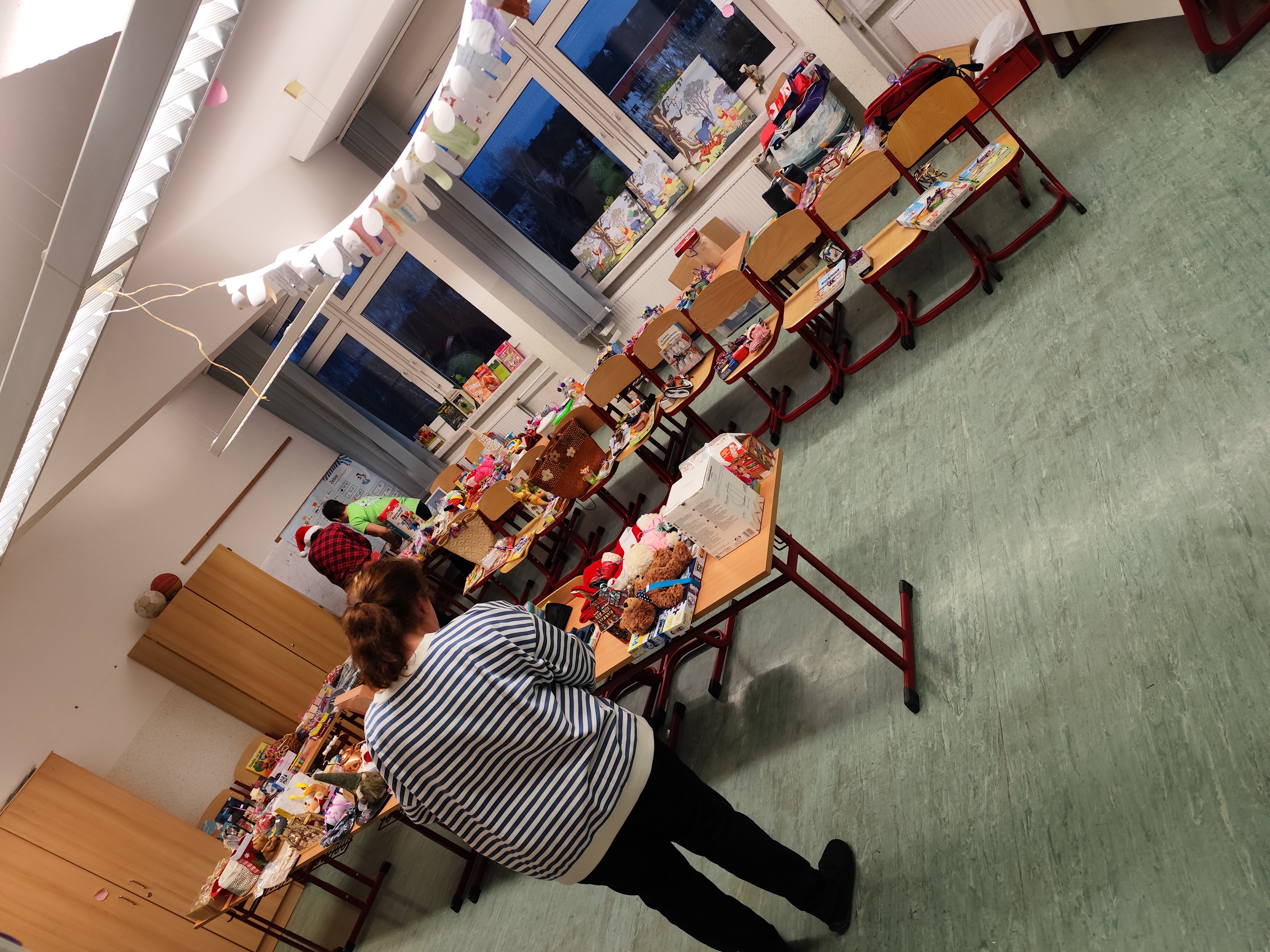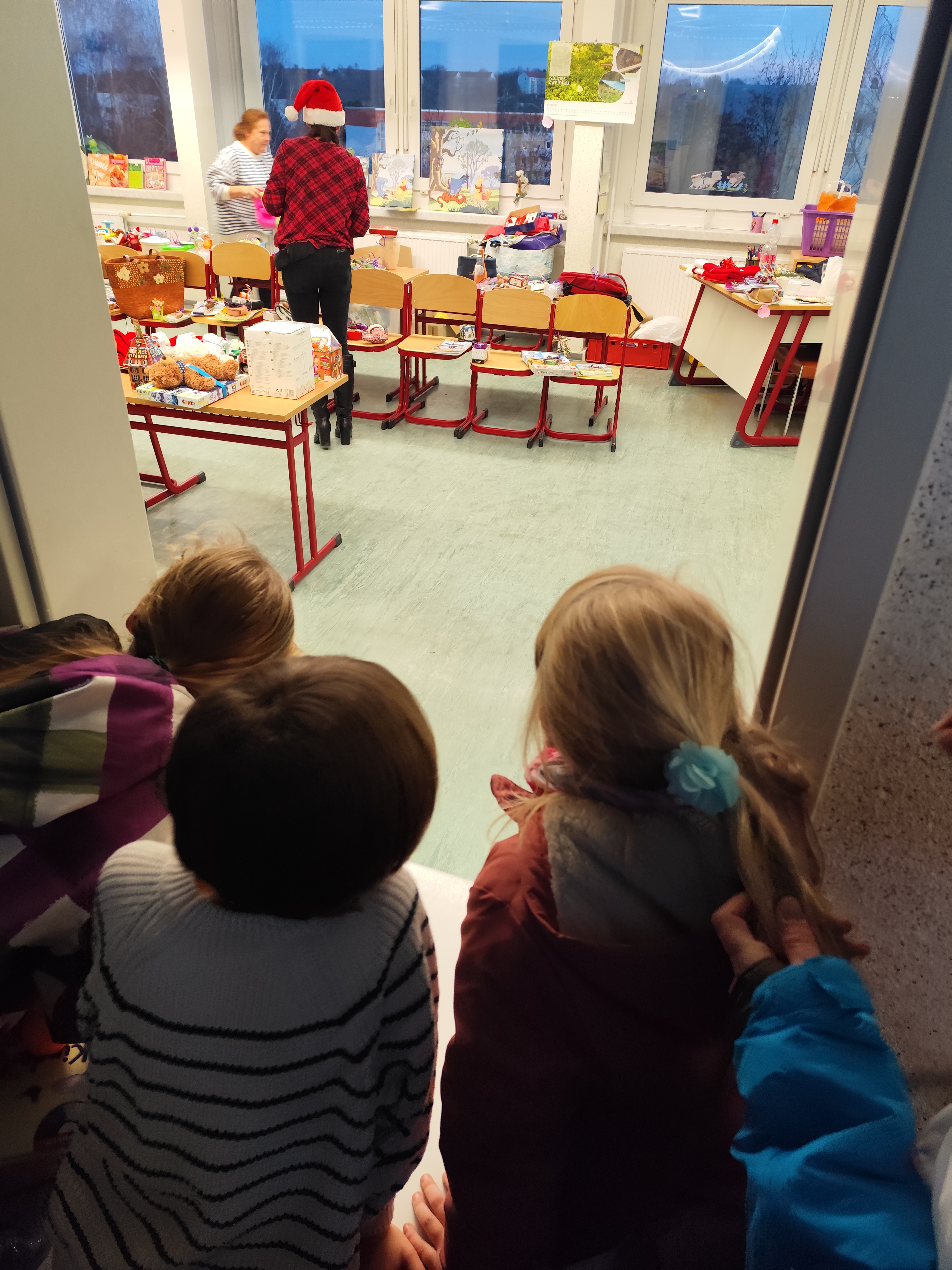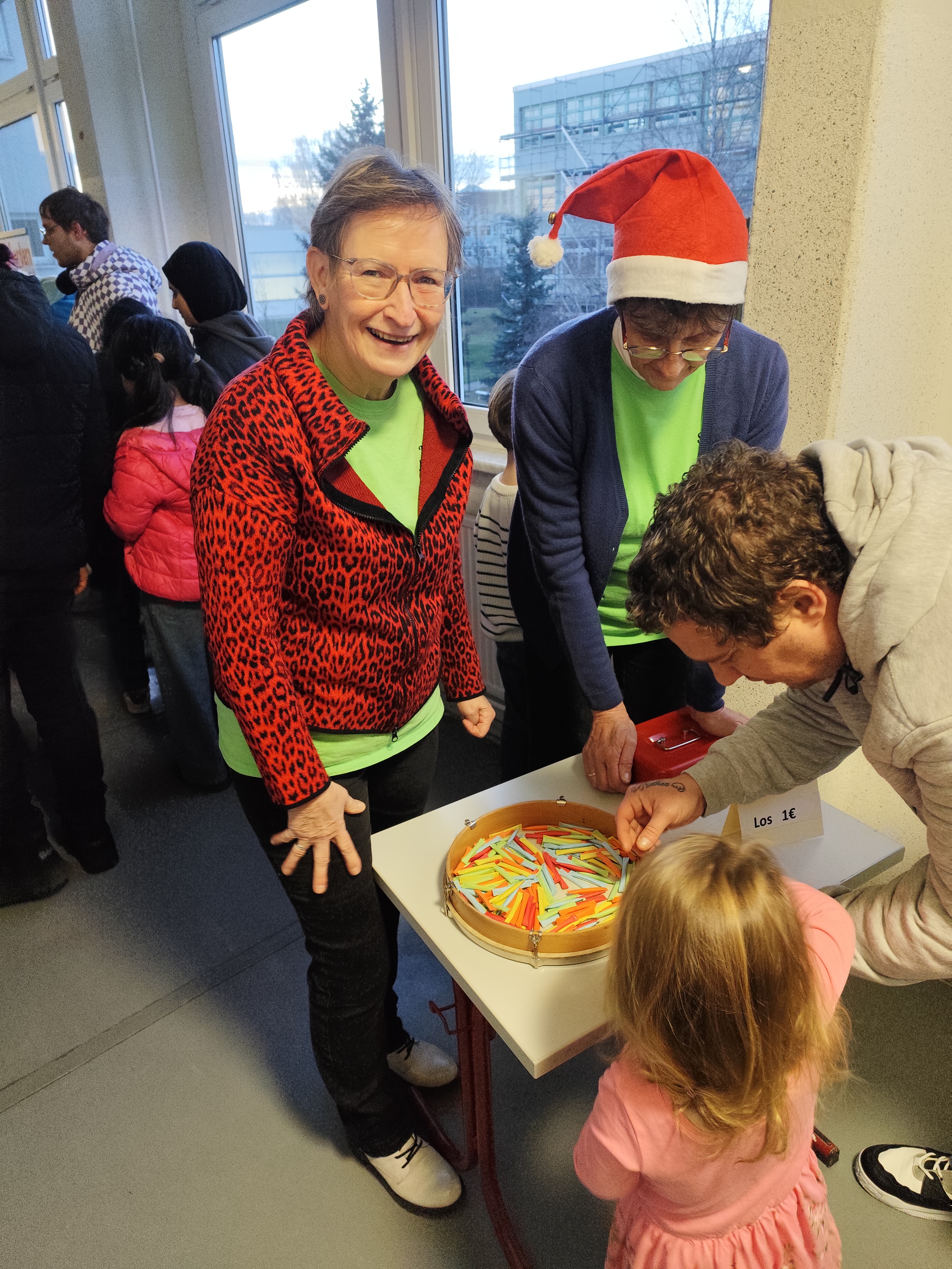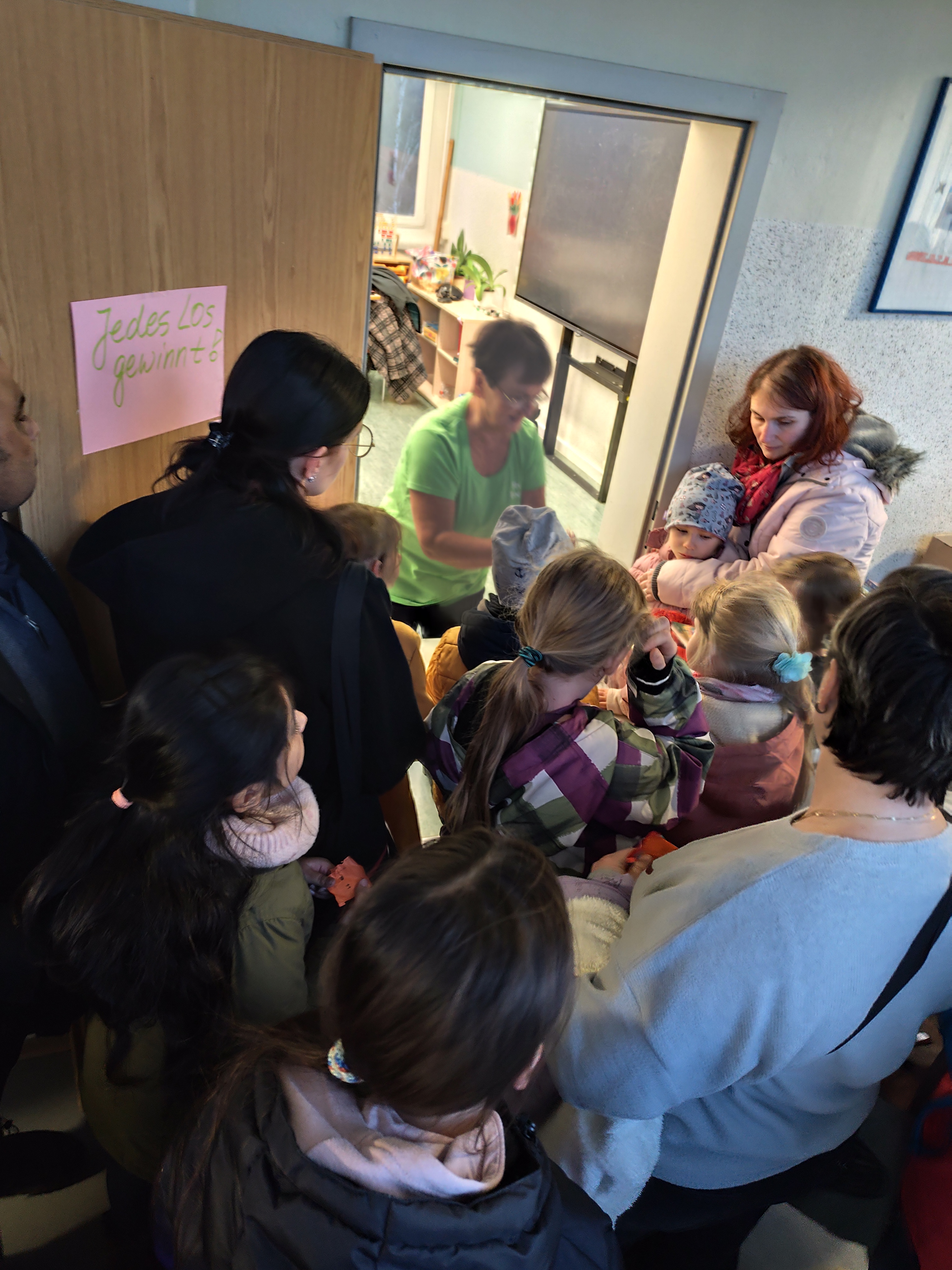 Außerdem war unser Förderverein wieder tatkräftig im Einsatz und veranstaltete die beliebte Tombola, bei der es – wie immer – keine Nieten gab. Kein Wunder, dass der Andrang groß war! Viele gespendete Weihnachtsartikel, Spiele, Bücher und andere Dinge erfreuten die Besucher. Nach einer Stunde waren alle 300 Lose verkauft und alle Präsente an das Kind, die Frau oder an den Mann gebracht und mit großer Freude entgegen genommen.
